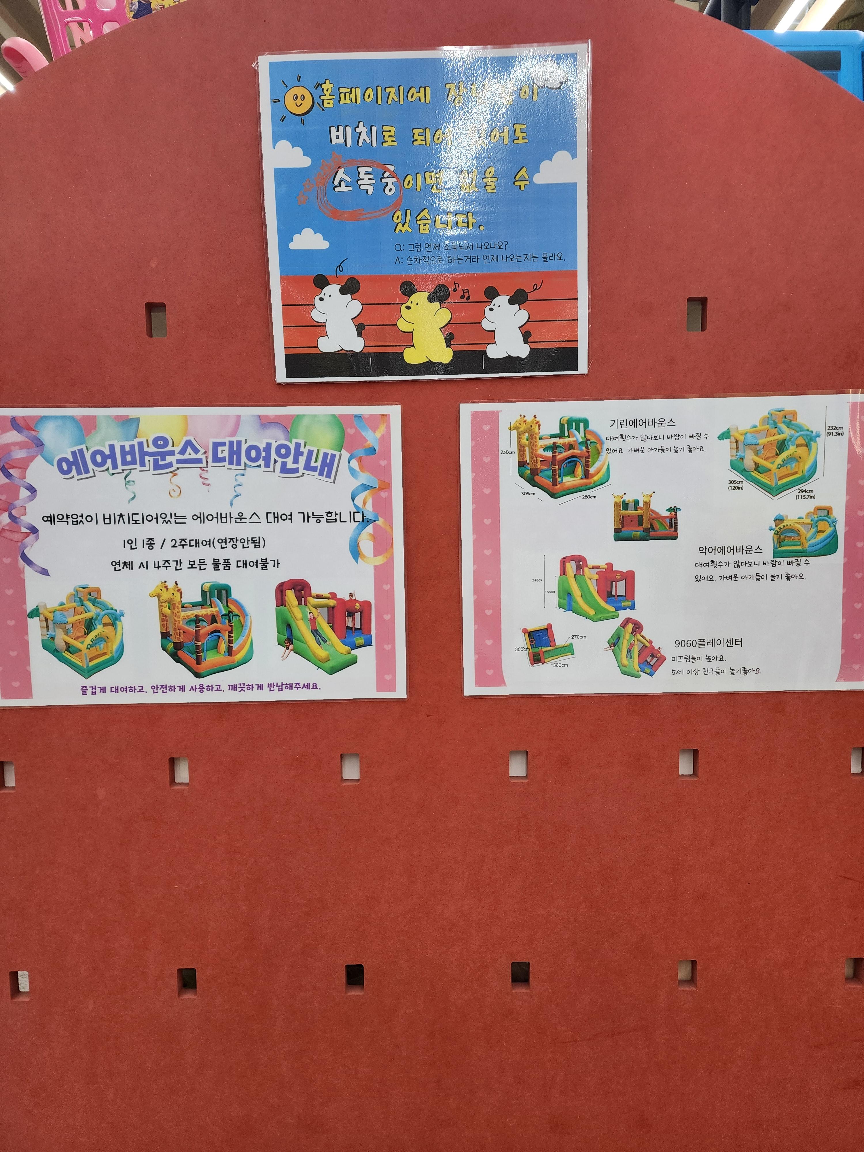 우리는 첫 대여에 운 좋게(?) 에어바운스가 있어서 빌릴 수 있었다. 사실 에어바운스가 뭔지 잘 몰랐는데, 보통 다 나가고 없어서 이렇게 비치되어 있는 경우는 거의 없다고 말씀 주셔서 반사적으로 빌려오게 되었다는;;ㅎ 덩치가 엄청나서 하필 비오는 날에 이걸 들고 주차장까지 가는 게 힘들기도 했지만, 집에 가서 설치하고 나니 방방 뛰며 좋아하는 아드님 덕에 빌린 보람은 있었다. 🤣